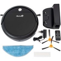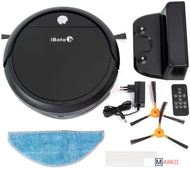 Робот-пылесос.Зарядная станция.Контейнер для сухой влажной уборки.Пульт ДУ.Сетевой адаптер.Запасные аксессуары: две боковые щетки, салфетка и фильтр.Инструкция по применению.Упаковка.
