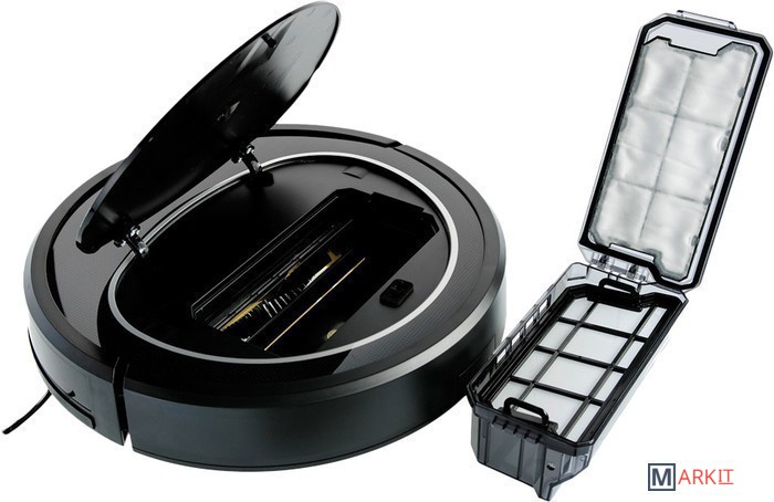 Оснащён турбощёткой, литиевым аккумулятором, пылесборником с двойной фильтрацией и HEPA-фильтром. Управлять пылесосом можно с пульта или с панели управления, оснащённой экраном и сенсорными кнопками. Функция уборки по расписанию позволяет задать своё время начала уборки для каждого из семи дней недели. Есть часы реального времени. Пылесос очень тихий.