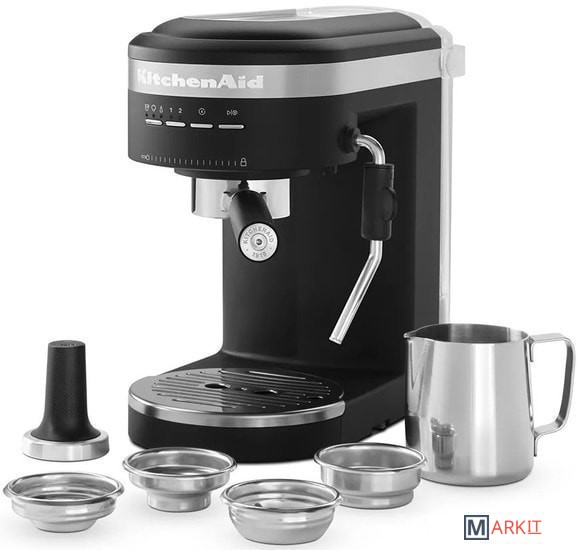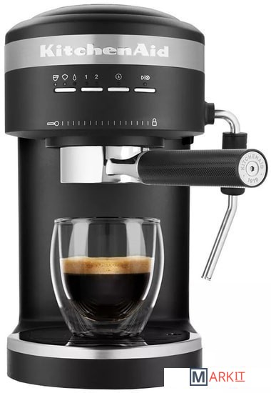 Кофеварка Espresso KitchenAid, Artisan рожкового типа в считанные минуты сделает для вас ароматный и бодрящий эспрессо. Емкость резервуара для воды составляет 1.4 л, что позволяет за один раз приготовить сразу несколько чашек любимого напитка. А если вас отвлек важный телефонный разговор или срочно пришлось уйти из дома, не переживайте - кофе не остынет: в приборе предусмотрены специальные функции сохранения тепла и подогрева чашек.