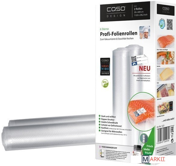 Очень прочная и устойчивая к разрыву плёнка толщиной 160 мкм. Рифлёная структура пакета для создания вакуума.Крепкий и надёжный шов.В комплекте стикеры с QR-кодом для маркировки.Витамины и минералы сохраняются дольше.Плёнка без BPA.Защищает продукты от морозного ожога и потери аромата.Возможно многоразовое использование и мойка в ПММ.Приготовление продуктов при 100° C максимум 4 часа и в СВЧ до 70° C.Идеально подходит для Sous Vide.Подходит для всех бескамерных вакуумных упаковщиков.Используйте приложение CASO FOOD MANAGER для сканирования стикеров с QR-кодом и маркируете пакеты с продуктами. Таким образом, у вас всегда будет четкое представление о том, что находится в вашем холодильнике или морозильной камере, а так же Вы получите оповещение на свой телефон об окончании срока годности.Составляйте список продуктов с возможностью сортировки по типу продуктов (рыба, мясо, овощи) или месту хранения (холодильник/морозильник/шкаф).