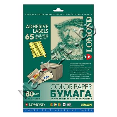 Самоклеящаяся бумага LOMOND (2130215) A4, 65 дел (38x21,2мм), лимонно-желтая, 50 листов Код: 4837