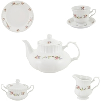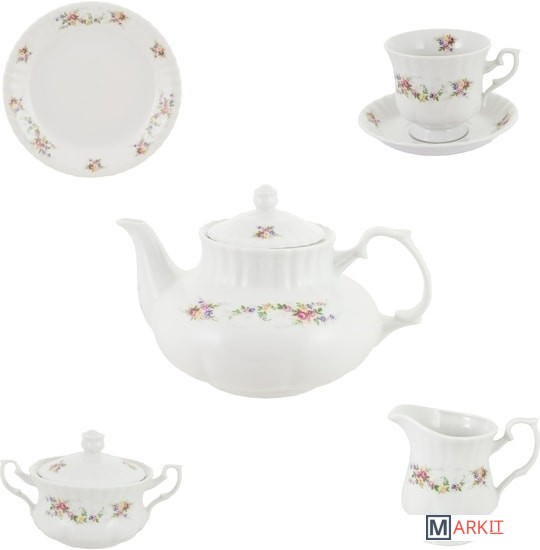 1 чайник 1.6 л, 1 сахарница 300 мл, 1 сливочник 300 мл, чашки 220 мл - 12 шт. и блюдца 14 см-12 шт., десертные тарелки 17 см - 12 шт.