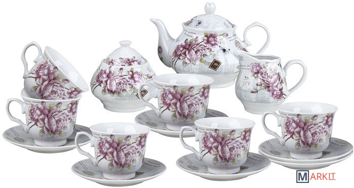 15 предметов6 чашек 250 мл с блюдцами, чайник 900 мл, молочник 200 мл, сахарница 250 г.