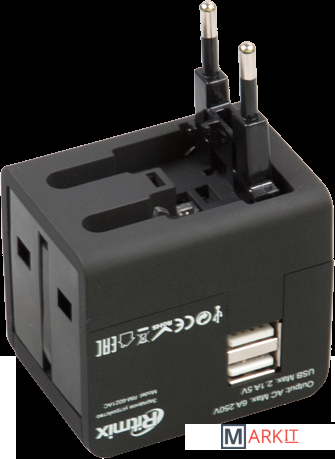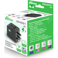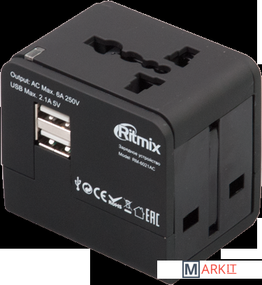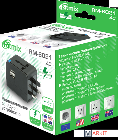 ОПИСАНИЕ СПЕЦИФИКАЦИЯRitmix RM-6021 – это сетевой адаптер, который имеет 2 USB-разъёма для зарядки мобильных устройств через USB-кабель (электронные книги, плееры, мобильные телефоны и т.д.) и 4 вида вилок: евро вилка, вилка США, вилка для Австралии, вилка для Великобритании. Также устройство оснащено универсальным входом для вилок данных стандартов.