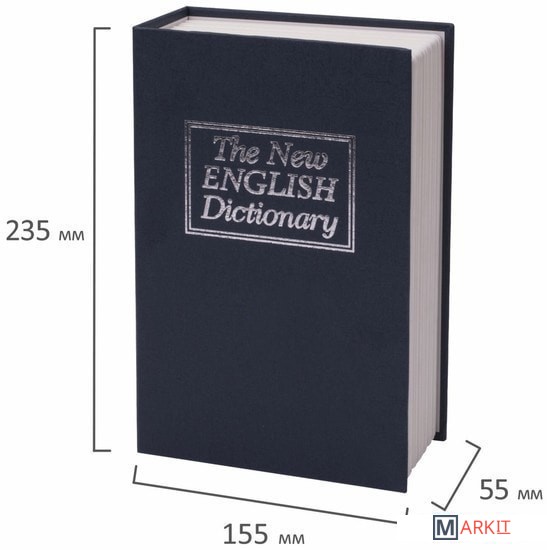 Ящик из прочной стали с ключевым замком BRAUBERG. Используется для ограничения доступа посторонних лиц. Незаметен на книжной полке дома и в офисе. Отлично подойдет в качестве подарка или сувенира.Ящик стилизован под книгу «Английский словарь». Обложка выполнена в тёмно-синем цвете. Книга-сейф — это металлический бокс в виде ложной книги. Предназначен для хранения мелких ценных вещей: документы, медикаменты, печати, мелкая наличность. Оригинальный, удобный бокс, который можно использовать как тайничок: бокс маскируется под книжку, незаметен среди других книг на полке. Главная особенность такой вещи в том, что выглядит она весьма оригинально, благодаря чему нравится многим. Фраза «Книга — лучший подарок» еще никогда не была так актуальна.Размеры 55х155х235 мм. 1 отделение. 2 ключа в комплекте.