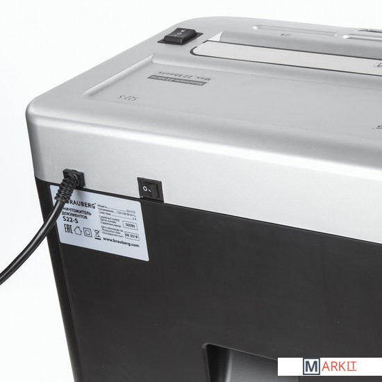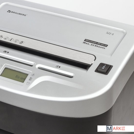 Уничтожитель документов (шредер) BRAUBERG S22 предназначен для уничтожения документов, компакт-дисков и пластиковых карт (банковских, дисконтных и прочих), потерявших актуальность.Отлично подходит для интенсивного персонального использования или коллективного использования в среднем офисе. Резка на полоски размером 4 мм обеспечивает P-2 уровень секретности (DIN 66399). Рекомендуемое количество пользователей — до 10 человек. За один раз уничтожает 22 листа формата А4. Объем корзины составляет 34 л.Дополнительным преимуществом данной модели является наличие функции энергосберегающего режима, т. е. когда аппарат не используется некоторое время — он находится в режиме готовности, но при этом снижается потребление энергии. Аппарат включится автоматически в момент начала уничтожения бумаги/компакт-диска/пластиковой карты.Данный уничтожитель снабжен надежными ножами, способными уничтожать скобы от степлера, что облегчает уничтожение скрепленных документов, экономя время потребителя. Отличительной чертой уничтожителя документов BRAUBERG является низкий уровень шума — всего до 56 Дб, т. е. тише, чем звук, издаваемый электробритвой. Шредер оснащен защитой двигателя от перегрева, что является частой причиной выхода из строя этой дорогостоящей запчасти на уничтожителях бумаги других производителей. Под входом для пластиковых карт/компакт-дисков предусмотрена отдельная небольшая корзина для того, чтобы отходы от карт и дисков не смешивались с отходами от бумаги, уничтожаемой через основной вход. Уничтожитель можно легко перемещать по офису, поскольку он оснащен колесами. При его установке в определенном месте можно зафиксировать передние колеса, чтобы шредер не перемещался.