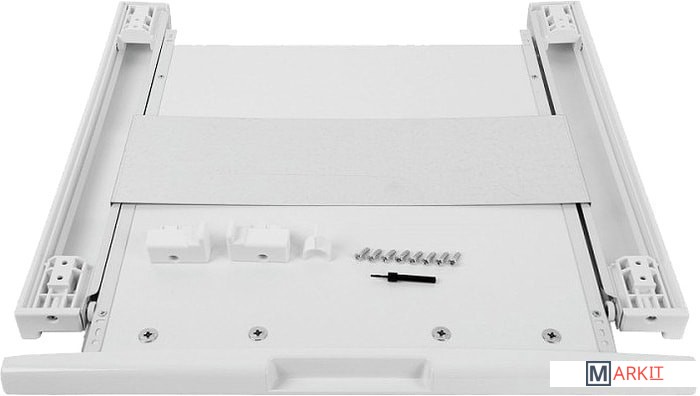 Соединительный элемент для установки сушильного аппарата на стиральную машину с выдвижной полочкой для белья.Максимальная нагрузка на полочку составляет 16 кг.Идеальное решение в условиях ограниченного пространства.