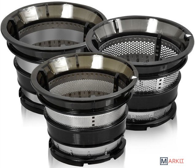 | Комплектация | - 3 сита для соков, пюре и сорбетов;- насадка ломтерезка;- насадка терка;- щетка для очистки. |