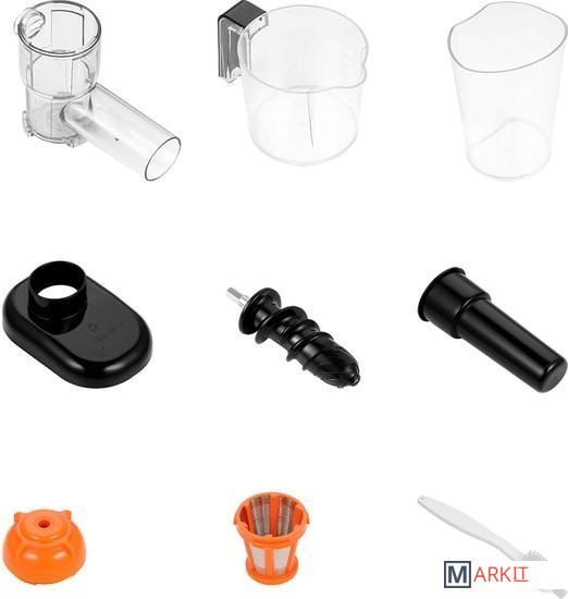 | Комплектация | Соковыжималка:моторный отсек - 1 штотжимной блок - 1 штшнек - 1 штфильтр - 1 штзажим - 1 штЛоток - 1 штТолкатель - 1 штКонтейнер для сока - 1 штКонтейнер для жмыха - 1 штЩётка для чистки - 1 штРуководство по эксплуатации - 1 штГарантийный талон - 1 шт |