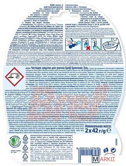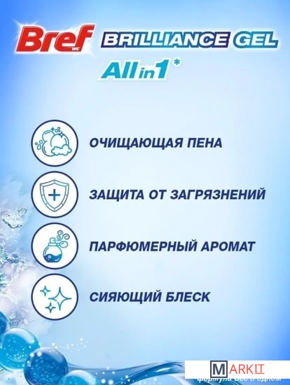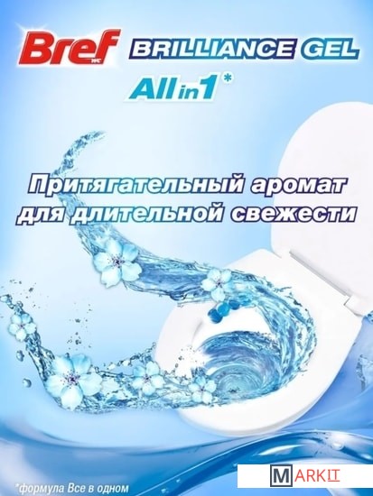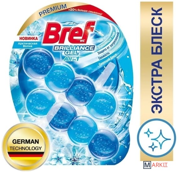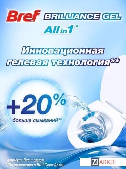 Туалетный блок Bref Brilliance Gel — инновационное решение для чистоты и свежести с формулой All in 1 в формате геля! Bref Brilliance Gel работает одновременно в нескольких направлениях: 1. Очищающая пена при каждом смывании 2. Защита от загрязнений 3. Свежесть при каждом смывании 4. Сияющий блеск Туалетного блока Bref Brilliance Gel хватит на 20%* дольше! *по сравнению с Bref Сила-Актив Преимущества использования Bref: - Удобство и простота в использовании: снимите защитную плёнку, повесьте блок под ободок унитаза в месте наибольшего потока воды. - Меньше времени на уборку туалета: Bref эффективно удаляет любые загрязнения и поддерживает унитаз в чистоте длительное время! - Наслаждайтесь свежестью и чистым ароматом с каждым смыванием! -Сохраняйте блеск унитаза в первозданном виде!