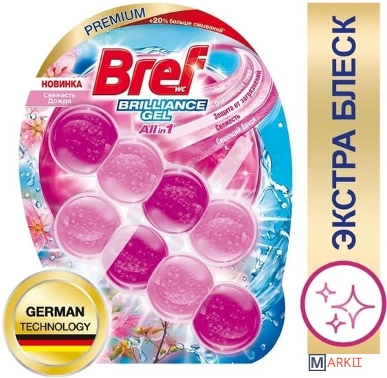 Туалетный блок Bref Brilliance Gel — инновационное решение для чистоты и свежести с формулой All in 1 в формате геля! Bref Brilliance Gel работает одновременно в нескольких направлениях: 1. Очищающая пена при каждом смывании 2. Защита от загрязнений 3. Свежесть при каждом смывании 4. Сияющий блеск Туалетного блока Bref Brilliance Gel хватит на 20%* дольше! *по сравнению с Bref Сила-Актив Преимущества использования Bref: - Удобство и простота в использовании: снимите защитную плёнку, повесьте блок под ободок унитаза в месте наибольшего потока воды. - Меньше времени на уборку туалета: Bref эффективно удаляет любые загрязнения и поддерживает унитаз в чистоте длительное время! - Наслаждайтесь свежестью и чистым ароматом с каждым смыванием! -Сохраняйте блеск унитаза в первозданном виде!