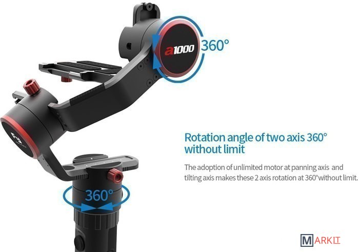 Стедикам для фотоаппаратов FeiyuTech A1000 - это новая модель стедикама для компактных фотоаппаратов весом до 1 килограмма. Модель оснащена новым процессором, системой моторов и гироскопом последних поколений. Кроме того, при наличии специального переходника A1000 можно использовать со смартфонами и экшн-камерами. FeiyuTech A1000 имеет следующие особенности:Вращение на 360 градусов.Вес без аккумулятора 700 грамм.Время автономной работы до 12 часов.Возможность спуска затвора через специальный кабель.Наличие удобного стика для управления положением камеры в 4 плоскостях.Перед тем как выбрать стедикам, ознакомьтесь со списком поддерживаемых моделей:Sony NEX-5NNEX-7 (и другие камеры N - серии)SONY A7RIIILCE-7R /ILCE-5100Благодаря встроенному модулю блютуз, вы легко можете синхронизировать ваш стедикам с приложением. Через приложение вы легко и быстро можете производить все необходимые настройки и калибровку - больше никаких томительных часов возле компьютера в поиске необходимой информации о процессе калибровки.FeiyuTech A1000 - это стабилизатор нового поколения, актуальный в 2018 году. Он основан на многофункциональной платформе, а такая функция как поддержка мобильного приложения значительно облегчает жизнь тем пользователям, которые впервые сталкиваются с таким устройством. Стоит отметить также и рекордное время съемки, при таких компактных размерах. FeiyuTech A1000 выпускается в двух вариантах. Более доступная модель имеет компактную ручку для захвата и удержания одной рукой, более дорогостоящая модель имеет в комплекте ручку для захвата и удержания двумя руками. Вариант с двойной ручкой подойдет для проф. операторов. Внизу рукоятки есть специальное резьбовое соединение, которое позволит закрепить вашу камеру со стедикамом на любой фотоштатив или другие фото крепления.В комплекте со стедикамом вы получаете удобный чехол для перевозки и хранения с жесткими стенками, а также полноценное зарядное устройство для аккумуляторов от сети. Кроме того, в комплект еще есть и небольшой трипод, чтобы установить стедикам в вертикальное положение на ровной поверхности - большего и не пожелаешь.Преимущества:Один из лучших стедикамов для компактных камер.Рекордное время работы от сменных аккумуляторов.Возможность установки любых смартфонов и экшн-камер.Совместимость с большинством компактных камер весом до 1 килограмма .Наличие блютуз модуля и поддержка настроек и калибровки через приложение.