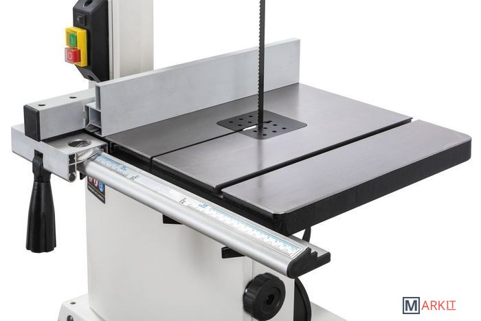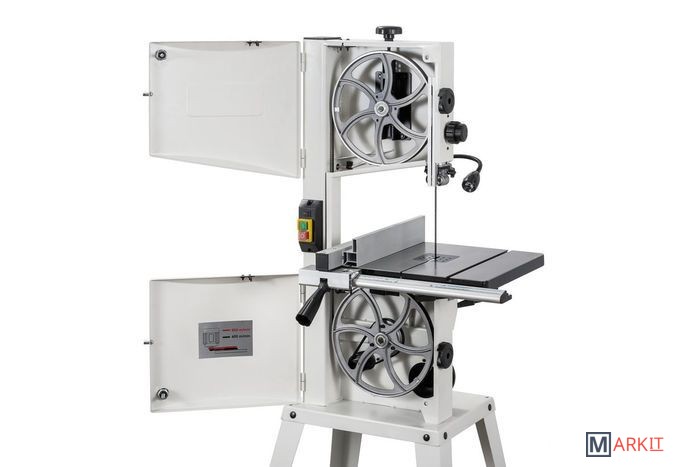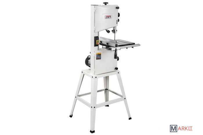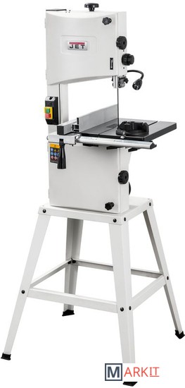- Две скорости движения пильной ленты- Роликовые направляющие пильного полотна- Регулировка наклона пильного стола- Регулировка высоты распиловки вращением рукоятки- Рабочий стол из чугунного литья- Регулируемый параллельный упор с эксцентриковым зажимом- Двухпозиционный регулируемый параллельный упор- Подвижный угловой упор с направляющей вдоль Т-образного паза- Светодиодная подсветка рабочей области- Комплект опорных ног для напольной установкиJWBS-10S – напольная ленточная пила с трехопорными роликовыми направляющими, чугунным рабочим столом и двумя скоростями, предназначенная для любительской эксплуатации. Ее рабочие параметры позволяют «распускать» довольно крупные заготовки с высотой до 152 мм, предусмотрен наклон стола для выполнения скошенных резов.Переустановив ремень, можно уменьшить скорость движения полотна с оптимальных для неплотной древесины 800 м/мин до 400 м/мин, что позволяет избежать прижогов заготовок из твердых пород.Станок оборудован регулируемым двухпозиционным параллельным упором. Он имеет две рабочие поверхности: высокую для перпендикулярных столу резов и толстых деталей и низкую для наклонного пиления и для плоских заготовок. Упор перемещается вдоль направляющего профиля с миллиметровой шкалой; для удобства позиционирования по ней, на корпусе сделан «целик», состоящий из увеличительного стекла с риской. Также в комплект входит скользящий угловой упор с направляющей вдоль Т-образного паза.Базовая конструкция станка хорошо отработана, она используется давно при производстве многих схожих моделей и, в случае Jet JWBS-10S, имеет ряд дополнительных эксклюзивных улучшений. Хорошо продуманы и удобно реализованы некоторые «мелочи», вроде светодиодной подсветки или «ступенчатого» патрубка аспирации, позволяющего без всяких переделок подсоединить шланг любого из трех диаметров (50, 75 или 100 мм).