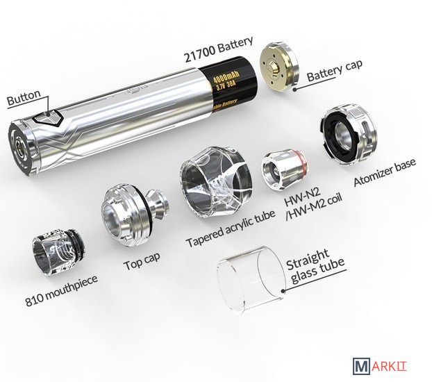 | Комплектация | 1 x iJust 21700 (без аккумулятора) 1 x ELLO Duro Atomizer (версия 5,5 мл / 2 мл) 1 x Головка HW-M2 0,2 Ом 1 x Головка HW-N2 0,2 Ом 1 x Кабель USB QC 2 x Руководства пользователя Запасные части |