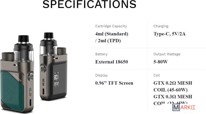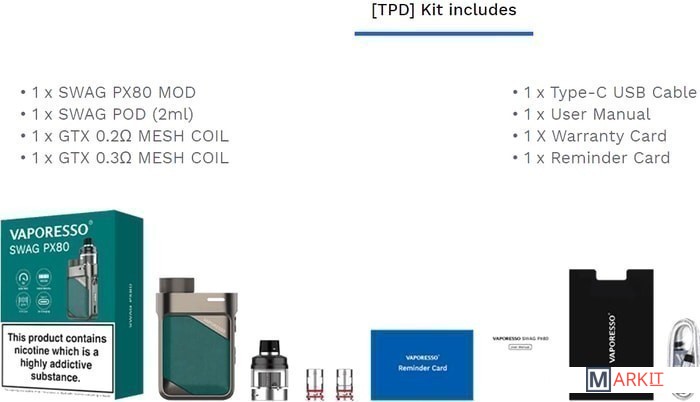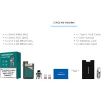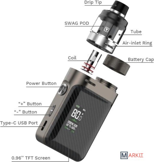 - батарейный мод- картридж 2 мл- сеточный испаритель 0.2 Ом (предустановлен)- сеточный испаритель 0.3 Ом- кабель для зарядки (USB Type-C)- дриптип- документация |