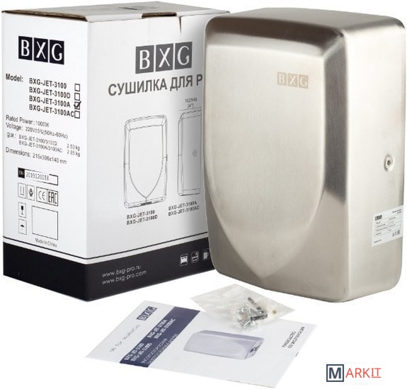 BXG-JET-3100А – Высокоскоростная сушилка для рук нового поколения с функцией Ультрафиолетового обеззараживания. Антивандальный корпус сушилки изготовлен из нержавеющей высококачественной стали марки 304, устойчивой к физическому и химическому воздействию.Гигиеничность.Встроенная система Ультрафиолетового излучения одновременно с процессом сушки рук обеззараживает поверхность ладоней. Излучение от УФ светодиодов составляет 395-405 нм, что абсолютно безопасно для человека, но его достаточно для инактивации микроорганизмов (бактерий, вирусов, микробов), находящихся в воздухе туалетной комнаты. Воздух, попадая на руки, проходит через губчатый фильтр из пенополиуретана, который задерживает всю крупно- и мелкодисперсную пыль туалетной комнаты.Производительность.Установлен инновационный мотор –скорость воздушного потока составляет 100 м/сек, при номинальной его мощности 600 Вт., при этом уровень шума всего 65 db. Благодаря этому руки становятся сухими менее чем за 7 секунд. В устройстве 2 температурных режима: горячий и холодный, что позволяет комфортно сушить руки в различных климатических условиях.Безопасность.BXG-JET-3100А обладает самым высоким классом влагозащиты IPX4 (исключено попадание влаги вовнутрь устройства со всех сторон) и возможность короткого замыкания или удара электрическим током при правильной эксплуатации исключена.. Благодаря ИК-датчикам и технологии микропроцессорного управления осуществляется независимый контроль, который предотвращает слишком долгое использование сушилки или использование не по назначению. Прибор оснащён устройством автоматического отключения на случай перегрева, короткого замыкания или скачков напряжения в электросети.Экологичность.Сушилка изготовлена из высококачественных материалов, которые полностью безопасны и не токсичны. Низкий уровень потребляемой мощности с возможностью отключения нагрева воздуха и быстроты сушки рук, позволяет экономить электроэнергию.