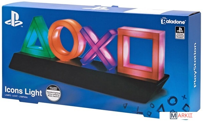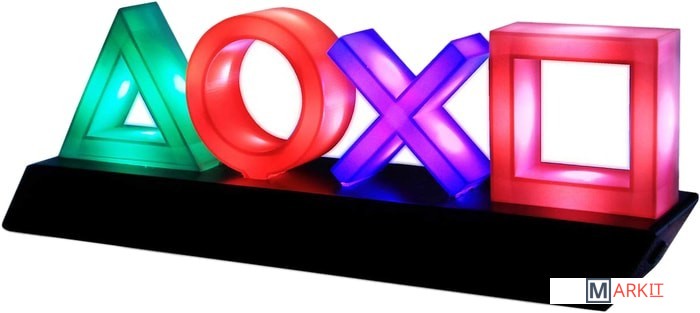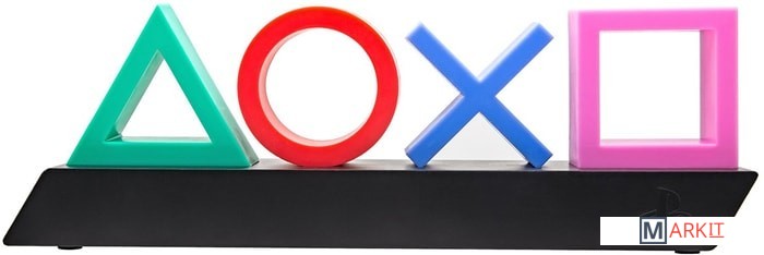 Подсветка с классическими символами кнопок контроллера PlayStation на гладком черном постаменте;Выберите один из 3 режимов освещения: стандартное освещение, фазировку цвета и реагирование на музыку;Этот продукт изготовлен с использованием BDP, что расшифровывается как Breakdown Plastic - органическая добавка, которая помогает пластику разлагаться на свалке, не влияя ни на его структурную целостность (до захоронения), ни на пригодность продукта к переработке.Питание: USB-кабель или 3 батарейки AAA (не входят в комплект);Playstation Icons Light - это официально лицензированный продукт.