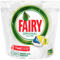 Капсулы для посудомоечной машины Fairy Original All in One идеально отмывают посуду со сложными загрязнениями с 1-го раза. Fairy Original содержит гель и порошок в одной капсуле. Капсула растворяется гораздо быстрее, чем другие таблетки для посудомоечной машины, и начинает действовать немедленно.