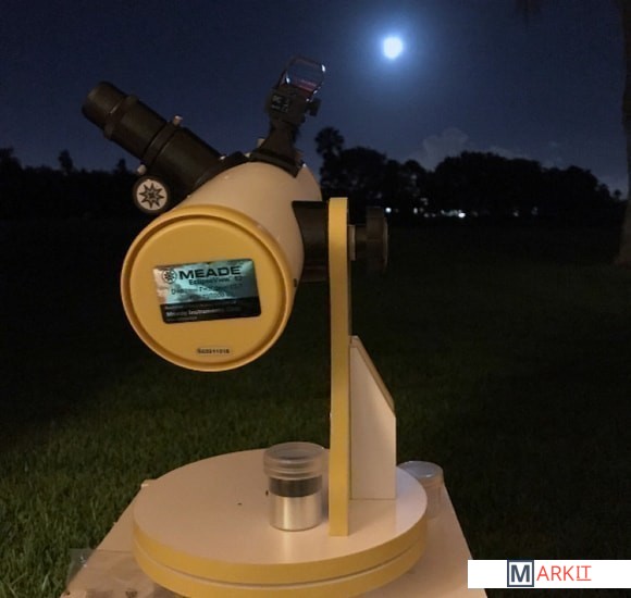 Очень легкий и очень компактный зеркальный телескоп на настольной монтировке. Универсальный: можно наблюдать за Солцем (в комплекте солнечный фильтр) и ночным небом.