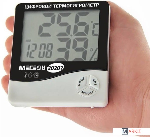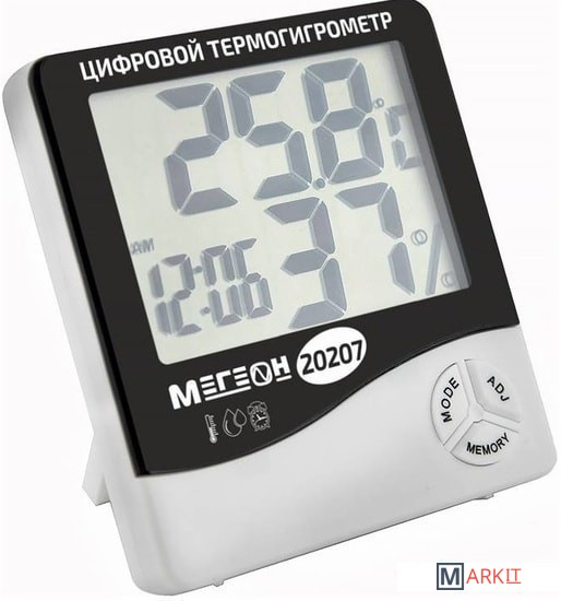 МЕГЕОН 20207 это настольный прибор для измерения температуры и влажности воздуха в помещении, кроме этого в прибор встроены часы (работающие в 12 или 24 часовом формате), будильник и отображение текущей даты, сохраняет в памяти минимальную и максимальную зафиксированную температуру и влажность. Прибор оснащен большим высококонтрастным жидкокристаллическим дисплеем, на котором одновременно отображаются температура, влажность и текущее время, а использование современной элементной базы позволило достичь высокой точности измереных значений. Благодаря современному эргономичному дизайну термогигрометр идеально впишется в интерьер любого дома, а функция фиксации минимального/максимального значений температуры будет полезной при использовании прибора в загородных домах и складских помещениях.
