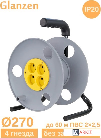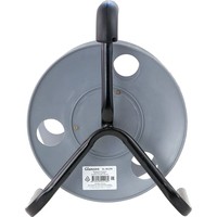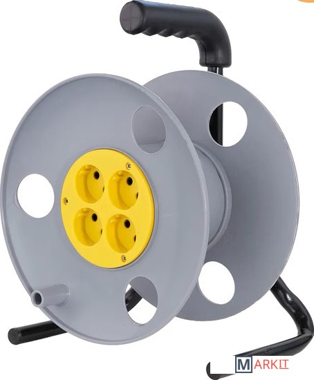 Пластиковая катушка без провода, металлическая тренога, 4 гнезда без заземления.Диаметр катушки: 270 мм.Максимальная вместимость провода ПВС 3х2,5: 60 м.Максимальная вместимость провода КГ 3х2,5: 50 м.