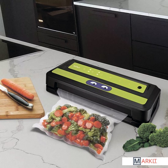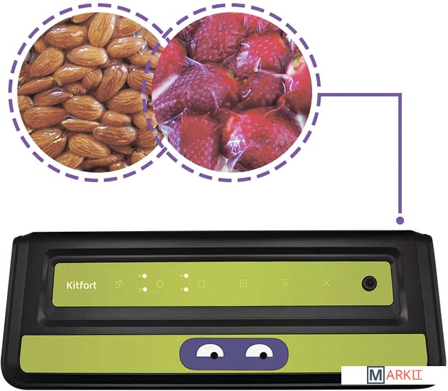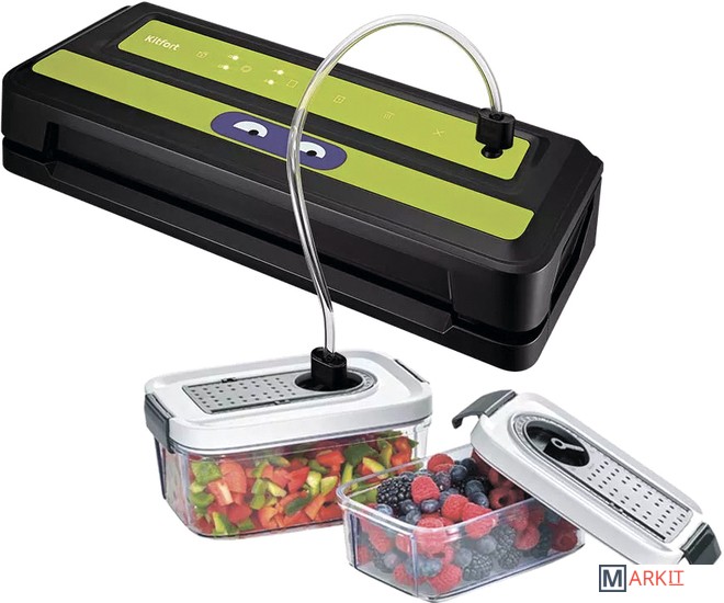 Вакууматор Kitfort КТ-1531 обеспечит долгие сроки хранения ваших любимых продуктов. Продукты, упакованные под вакуумом, сохраняют дольше аппетитный вид, вкус и полезные свойства, а портятся существенно дольше по сравнению с обычными условиями хранения.Открытый край пакета укладывается под крышку прибора, и после выбора режима, вакууматор выкачает из него воздух. В результате образования вакуума пакет плотно обжимает содержимое. Как только воздух удалён, начинается запечатка открытой стороны пакета.«Контейнер» – откачивание воздуха из контейнеров; «давление» - выбор нормального и низкого давления; «режим» - выбор режима запечатывания для сухих или влажных продуктов; «авто» - автоматическая упаковка; «запечатывание» - запечатывание шва пакета.У КТ-1531 есть режимы для вакуумирования сухих, влажных и мягких продуктов с различным временем запечатывания. Влажные продукты могут намочить край пакета, поэтому время запечатывания требуется увеличить.У КТ-1531 можно активировать режим откачки воздуха из контейнеров. Вакуумирование проиходит при помощи шланга, вставленного в фитинг вакууматора одним концом, а другим в крышку контейнера. Вы можете дополнительно приобрести набор контейнеров КТ-1500-10.С нашей техникой очень легко подружиться, потому что она не только лёгкая и функциональная, но и будто живая с весёлыми глазами. Никого не оставит равнодушным. В любой момент вы можете отклеить этот стикер без вреда для поверхности.Создаваемое разрежение (максимум): 0.8 бар.Ширина шва: 2.5 мм.Уровень шума: ≤ 80 дБ.Длина шнура: 0.9 м.