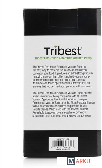 Портативный электрический вакууматор Tribest предназначен для откачивания воздуха из чаши блендера или вакуумных пакетов. Удаление воздуха перед смешиванием имеет следующие преимущества: предотвращение окисления продуктов, сохранение питательных веществ и насыщенности цвета ваших смесей и напитков. Кроме того, срок хранения смесей увеличивается из-за отсутствия кислорода. Смешивание в вакууме облегчает процесс измельчения ингредиентов, а также улучшает текстуру и вкус.Портативный электрический вакууматор Tribest – это один из самых универсальных приборов на вашей кухне. Мощный и одновременно бесшумный вакууматор совместим со следующими аппаратами Tribest: коммерческий вакуумный блендер Tribest Dynapro DPS-1050, персональный блендер Tribest Personal Blender Glass PBG-5050 с дополнительным стаканом (1200 мл) и вакуумной крышкой, многоразовые пакеты для вакуумного упаковщика Tribest Sousvant KL-200.