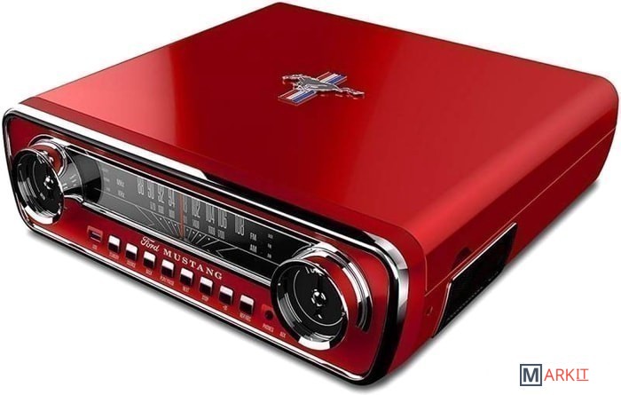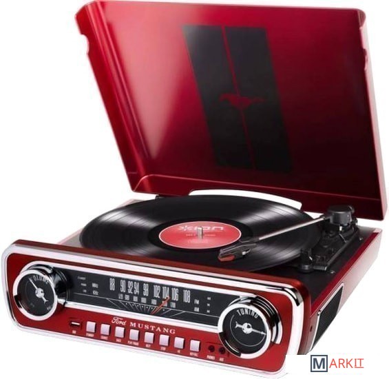 Mustang LP – виниловый проигрыватель, сочетающий в себе 4 функции: проигрыватель винила, AM/FM радио, внешние динамики, AUX и USB разъемы.В проигрывателе есть тихий ременный привод с 3-скоростным проигрывателем, устройство воспроизводит каждую запись в вашей коллекции и записывает их на USB-накопитель. Проигрыватель оснащен встроенными динамиками. Имеется дополнительный вход для подключения других устройств и разъем для наушников. Но то, что на самом деле отличает Mustang LP от остальных, это его FM-тюнер, который выглядит так же, как спидометр классического Mustang 1965 года, вплоть до того, что он окружен круглыми дисками с обеих сторон.