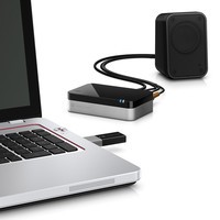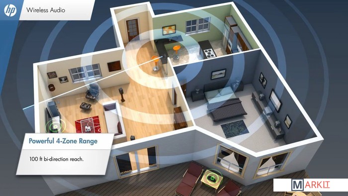 Беспроводная зуковая карта HP, позволяющая подключать к приемнику до 4 стереоколонок или систему 5.1 (по цифровому каналу). Состоит из передатчика с интерфейсом USB и приемника-усилителя.