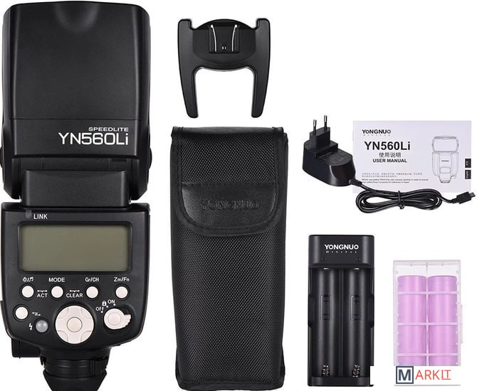 Обновлённая версия популярных вспышек Yongnuo. YN560Li оснащена сменными литий-ионными аккумуляторами, обеспечивающими более высокую скорость перезарядки. 2 аккумуляторастандарта 18650 обеспечивают более 500 срабатываний при полной мощности, а время перезарядки составит всего 2 сек. При съемке с радиоуправлением YN560Li может работать как ведущее и ведомое устройство, контролируя до 6 групп ведомых вспышек (YN560Li/YN720/YN685/YN560III/YN560IV/YN660) в следующих параметрах: режим срабатывания, мощность, угол освечивания головки, частоту и количество срабатывания вспышек. Вспышка YN560Li может работать в M/Multi режиме, принимая беспроводный сигнал от ведущих устройств YN720/ YN685/YN560 IV/YN660/YN560 III/YN560 TX/RF605/RF603/RF602. Ведущее числе GN58@ISO100, 105мм. Угол освечивания вспышки: 24 - 105 мм. У изделия имеется USB-разъем, с помощью которого можно обновлять программное обеспечение вспышки. Файл для перепрошивки доступен на официальном сайте компании YONGNUO. Поддерживает S1 и S2 режим. Функция пользовательских настроек (C.Fn) и функция автоматического сохранения настроек. Большой ЖК-дисплей, стандартный PC-разъем, звук - сигнал предупреждения