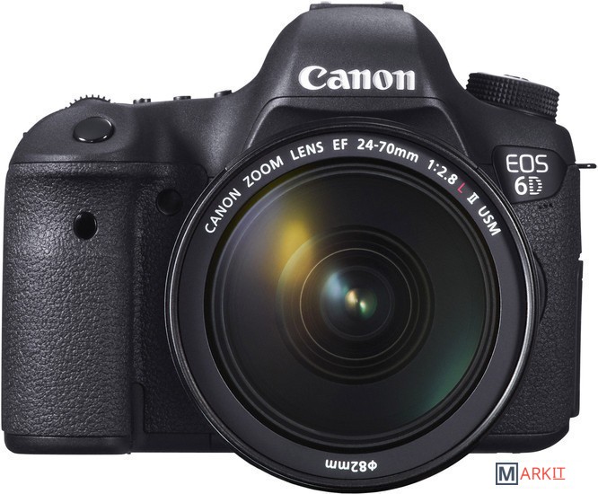 Цифровой зеркальный фотоаппарат семейства EOS компании, компактная и бюджетная модель с полнокадровой КМОП-матрицей (36x24 мм). Первый зеркальный фотоаппарат компании со встроенной поддержкой беспроводной передачи данных по технологии Wi-Fi и системы позиционирования GPS. По сравнению с EOS 5D Mark III, EOS 6D обладает упрощённой 11-точечной системой автофокусировки с центральной точкой крестового типа с чувствительностью до -3 EV, меньшим разрешением (20 мегапикселей вместо 22) и меньшей скоростью съёмки — 4.5 кадров в секунду вместо 6. Имеется только один разъём для карт памяти — Secure Digital. Комплект с объективом Canon EF 24-70mm f/2.8L II USM.